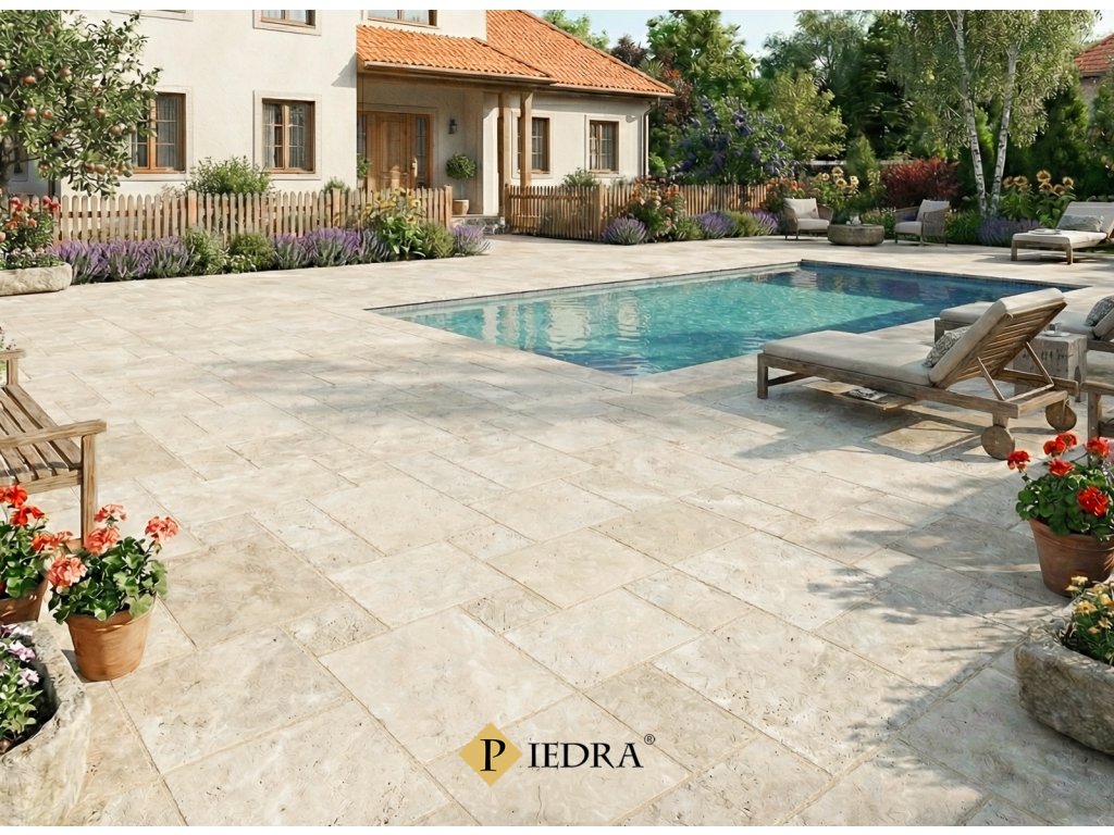 Trawertyn Ivory w stylu francuskim oferuje jasny, elegancki wygląd inspirowany tradycyjną architekturą śródziemnomorską. Szczotkowana powierzchnia podkreśla naturalną strukturę kamienia, a połączenie czterech formatów tworzy dynamiczny i ponadczasowy układ posadzki.
